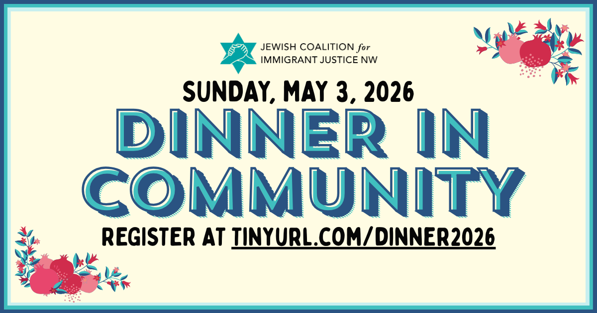 Registration is now open for our annual Dinner in Community on Sunday, May 3, in Central Seattle! This year’s event will center on the theme and Jewish value Kavod Habriyot, the dignity of all. Even amidst the crises of this moment, this evening is an opportunity to ground ourselves in why we do this work together: because all people are inherently deserving of dignity. Attacks on immigrants are attacks on our entire community and on our democracy. We are ready to show up with urgency, with joy, and with a bold commitment to building a future where all people are valued and cared for.