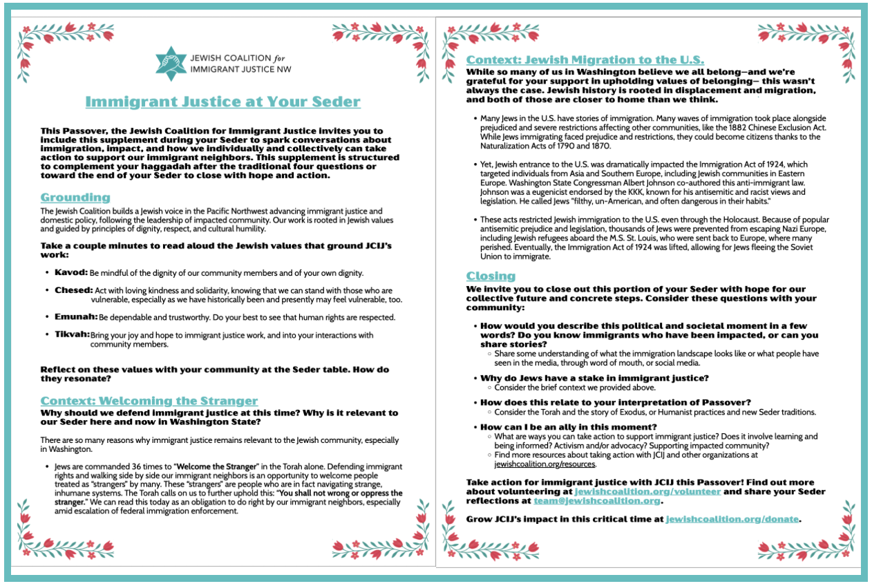 Reflect on immigrant justice at your Seder table: Check out the JCIJ Haggadah supplementand share it with your communities! Use it to spark conversations around immigration, impact, and how we individually and collectively can take action to support our immigrant neighbors. You can print copies of this supplement and add it after the traditional four questions, or use it to close your Seder with hope and action.